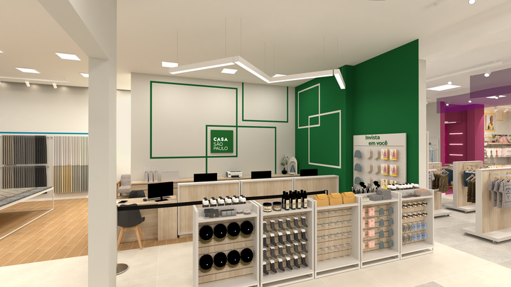 O resultado é uma loja com setores bem definidos, porém integrados por uma identidade espacial coesa.