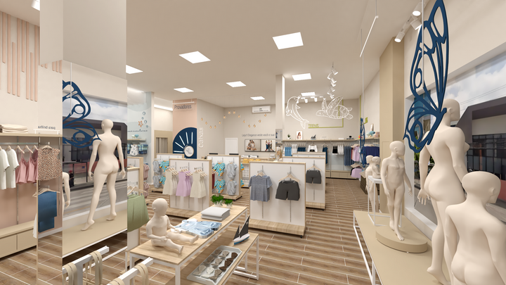 No setor infantil, o design incorpora adornos suspensos e lúdicos, convidando as crianças a se aproximarem e explorarem o ambiente. O percurso se estende até os provadores, que contam com um espaço de espera temático e elementos inspirados no fundo do mar, tornando a